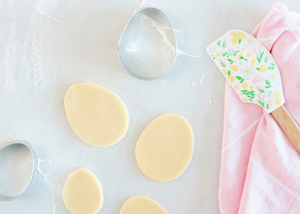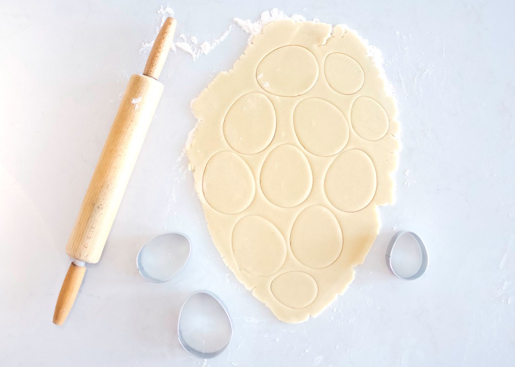 • Roll your dough on a floured service with a rolling pin and cut your shapes. I purchased my egg-shaped cookie cutters from Michaels