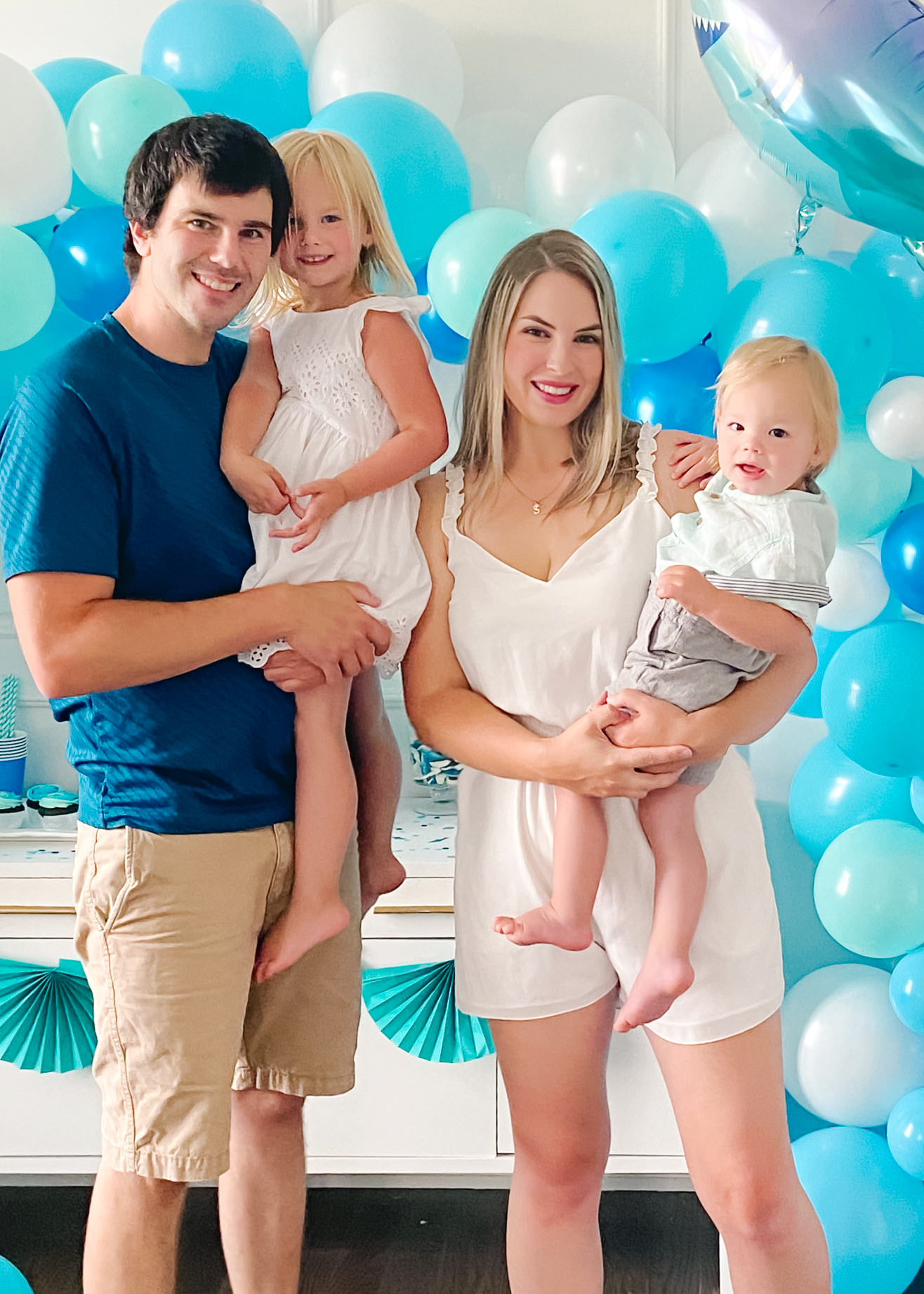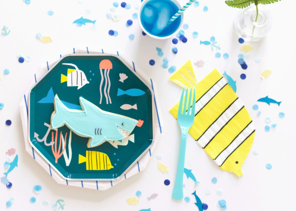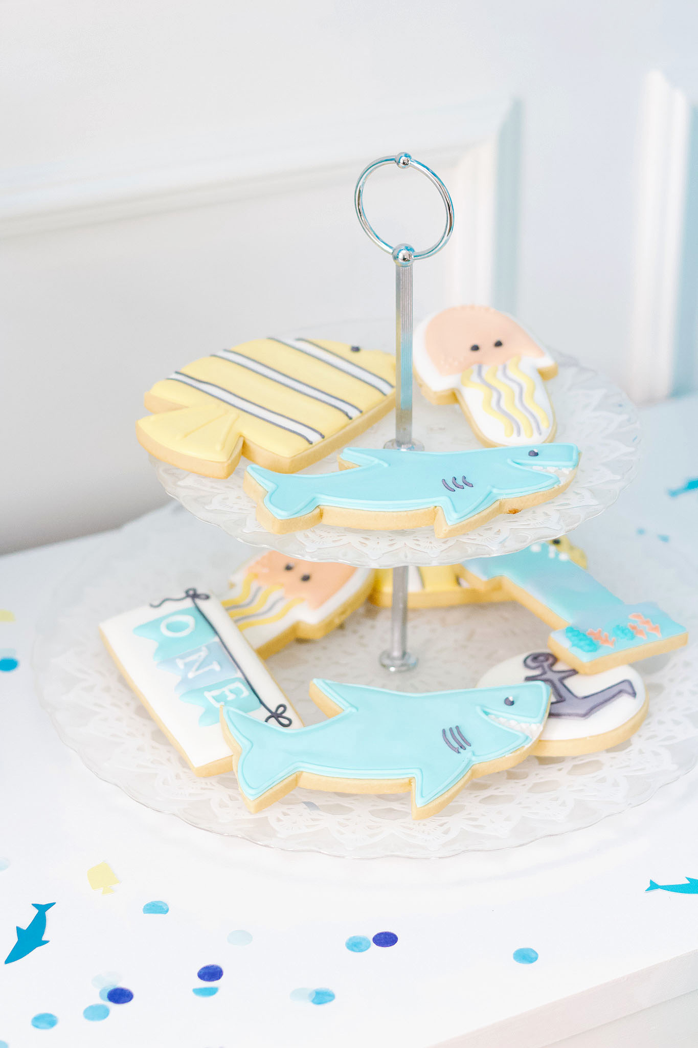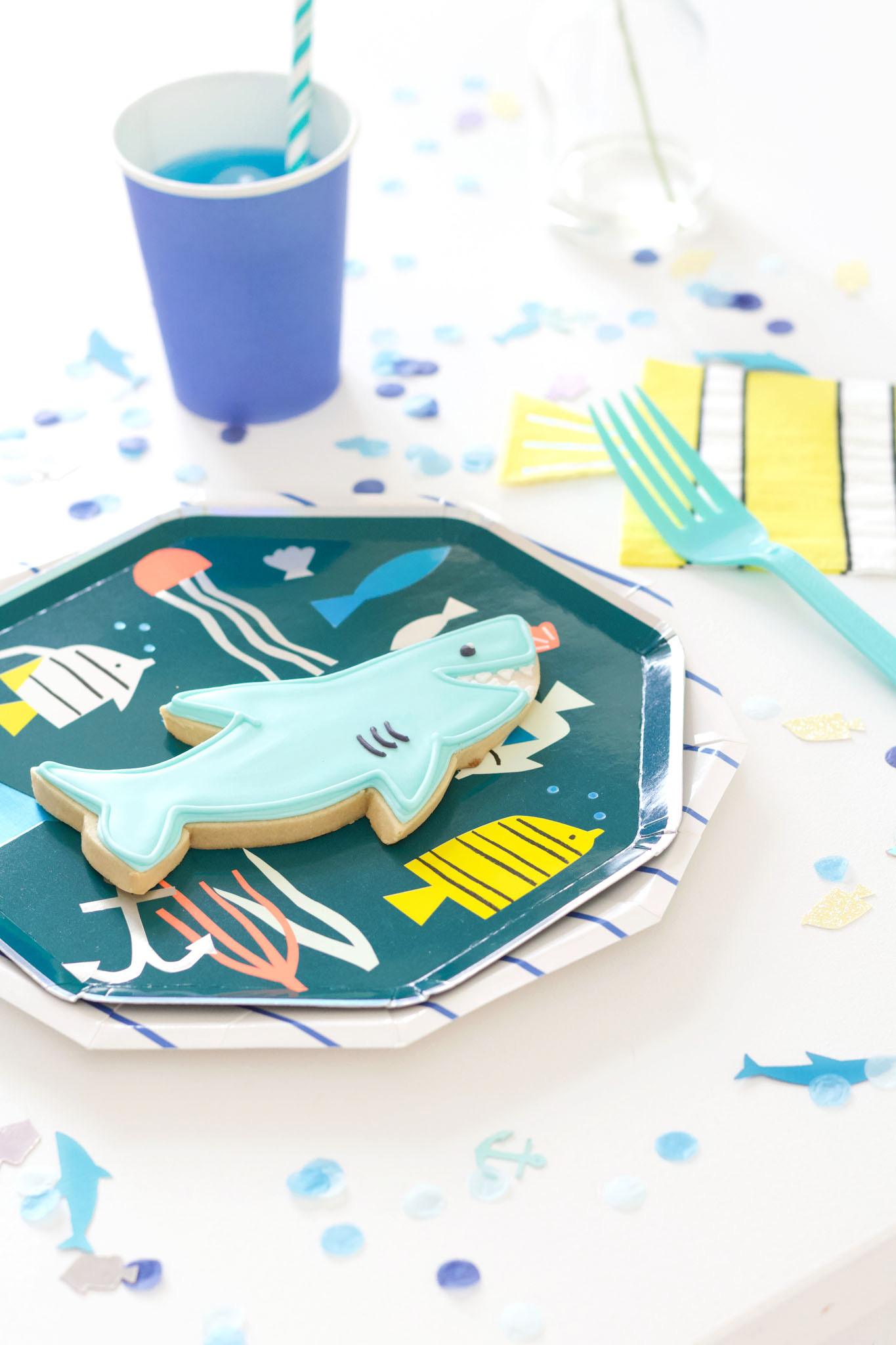 I collaborated with Lil Penguin Parties on the party accessories and I have to say I absolutely love her under the sea collection! I went with an under the sea theme for Clara’s first birthday as well but that version was much more “mermaid” vibes and contained a whole lot of pink and purple hues. This current collection of tableware definitely has a masculine vibe which I love for a little boy birthday party! How fun are the holographic sharks!? Make sure to check her Lil Penguin Parties for more amazing party accessories!