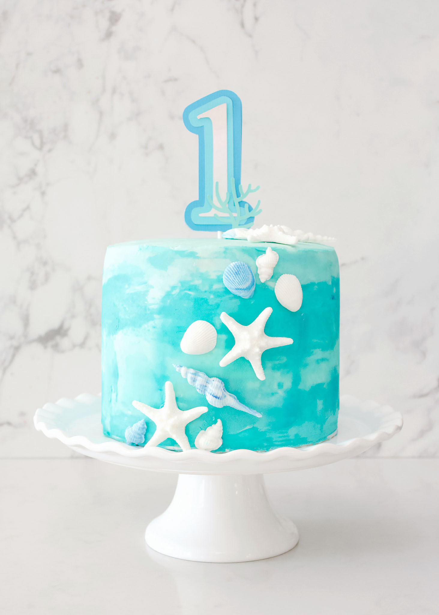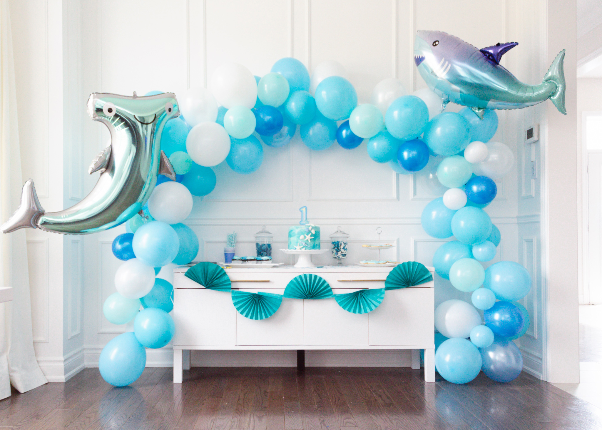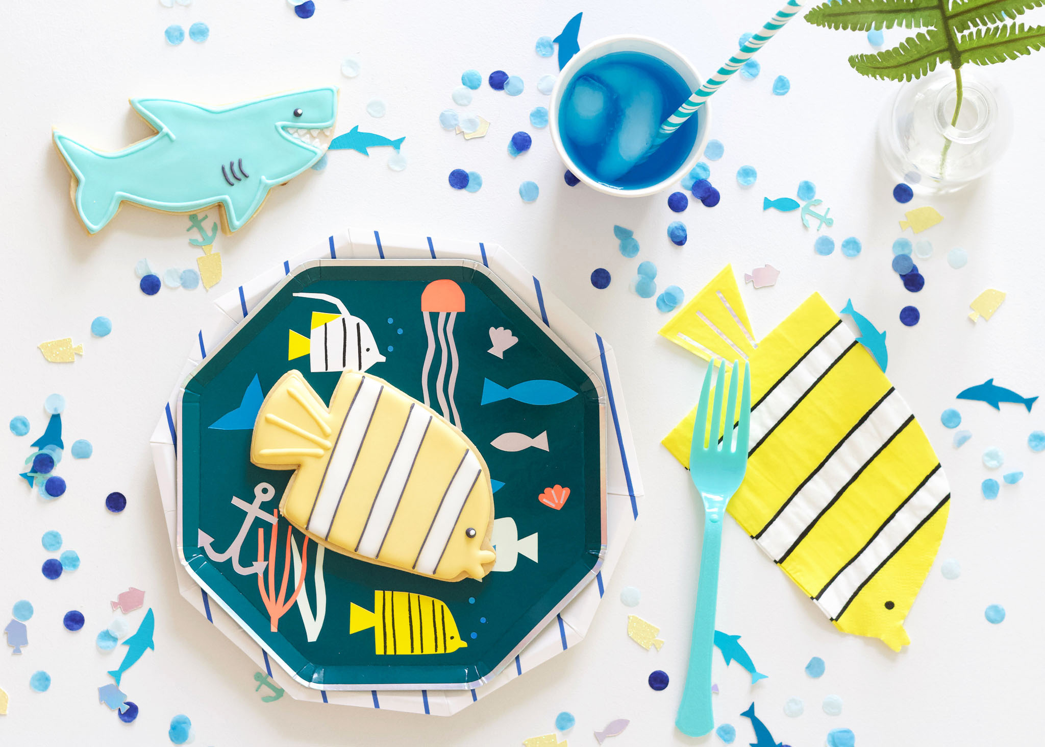 I collaborated with Lil Penguin Parties on the party accessories and I have to say I absolutely love her under the sea collection! I went with an under the sea theme for Clara’s first birthday as well but that version was much more “mermaid” vibes and contained a whole lot of pink and purple hues. This current collection of tableware definitely has a masculine vibe which I love for a little boy birthday party! How fun are the holographic sharks!? Make sure to check her Lil Penguin Parties for more amazing party accessories!