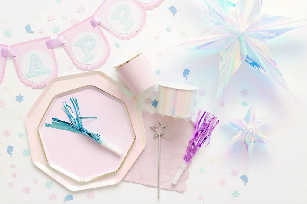 I also love to support small businesses and don’t mind splurging a bit on some pretty “statement pieces’ like these pretty gold rimmed lilac plates but it can get costly to buy everything online, especially if you have a lot of guests. So I like to get a few nicer pieces online. Then to save a bit of $$ by finding other items at the dollar store in a similar / complementary colour such as paper cups, party hats and extra napkins.. I also found straws, stir stick star “wands” and beautiful iridescent “treat cups” at Real Canadian Superstore!