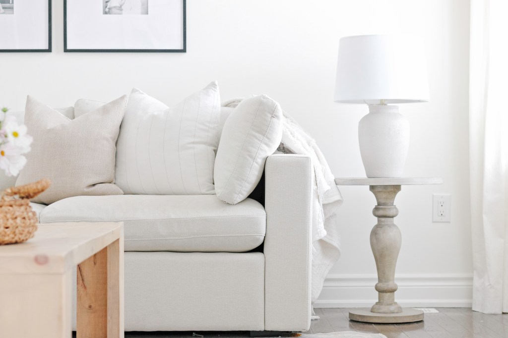 When shopping for my Cozey online, it was really easy to see all the configurations, and the measurements were easy to understand. I debated between ordering the L shape with 3 x 2 seats + corner (which would fit our wall perfectly) or the smaller 2 x 2 seat + corner sectional (which would allow room for a decent size side table). I decided on the 3×2 seater as it we would gain an extra seat than we had previously. I didn’t feel too stressed committing as the sectional is completely modular, so it won’t be hard to remove one seat if I decide I want a smaller sectional later on. As for the colour, I went with “Sunset Beige” which is fairly light, but still warm and cozy looking. It’s dark enough to hide some marks (pure white anything would not do so well for us with how common dirt smudges and food spills are with our two little ones) but still gives that airy vibe I love.